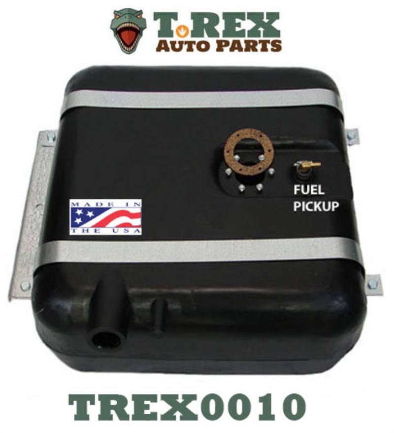 1946-1964 Willys Pickup 14-Gal. plastic fuel tank. The fuel pickup tube is installed on the top of the tank. An in-line fuel filter is required. Includes a new 5-piece strap kit and a new sending unit gasket. Requires in-line fuel filter. Approx. dimensions: 22" x 20" x 9". Replaces # 906153.