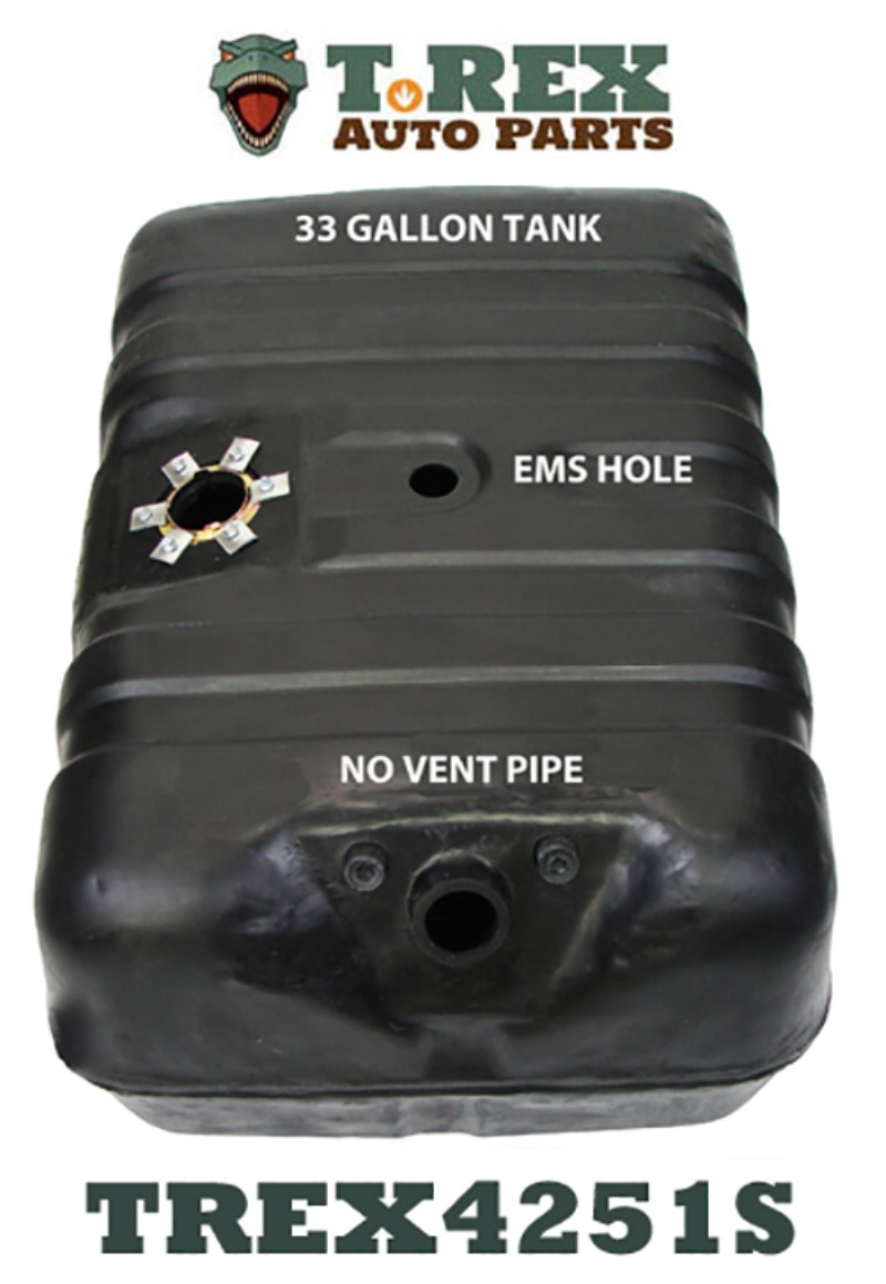 1980-1986 Ford Full-Size Bronco 33-Gal. fuel tank. This tank has an emission valve/rollover hole but it does NOT have an internal support vent pipe. The sending unit hole is approx. 2" in diameter. Includes a new lock ring and a new gasket. Approx. dimensions: 21" x 31" x 15". Replaces #'s: E0TZ-9002-G and E7TZ-9002-E. UPC #: 81060410720.