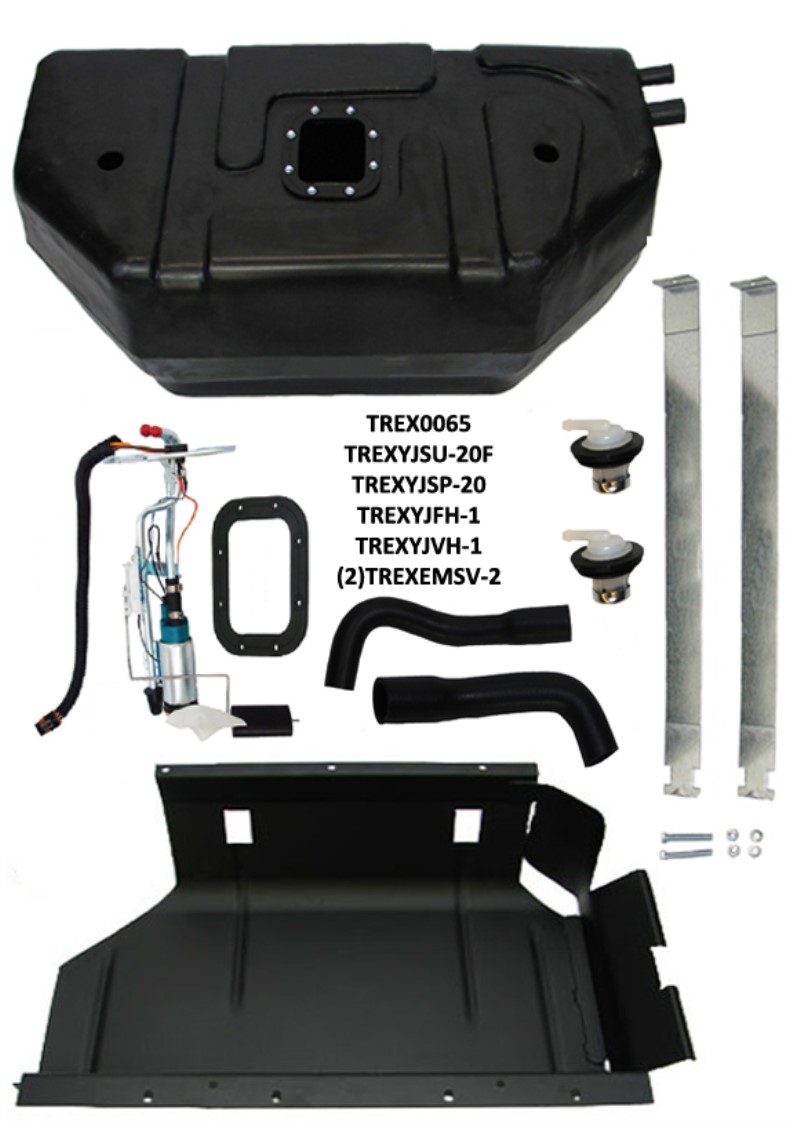 1991-1995 Jeep Wrangler YJ combo kit includes the 20 gallon plastic tank, Fuel Injected sending unit with fuel pump, skid-plate, fill hose, vent hose and (2) EMS valve's with grommets.
